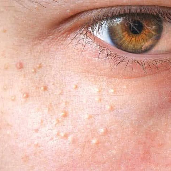 - Small, hard, white bumps often around eyes, cheeks, or forehead